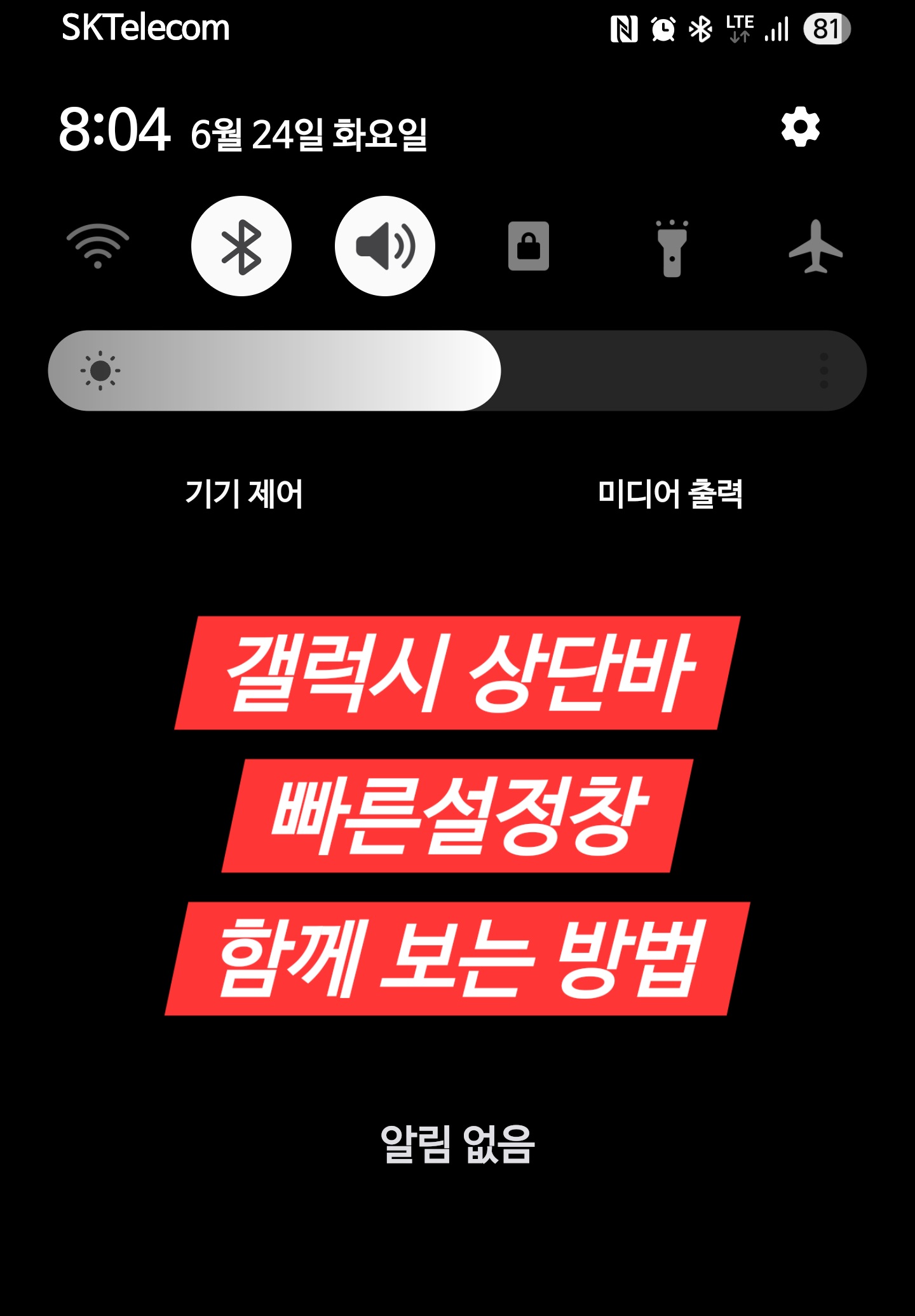 업데이트 한 상태인데 화면의 상단 왼쪽을 내리면 알림, 오른쪽을 내리면 빠른설정창 메뉴들이 있다.