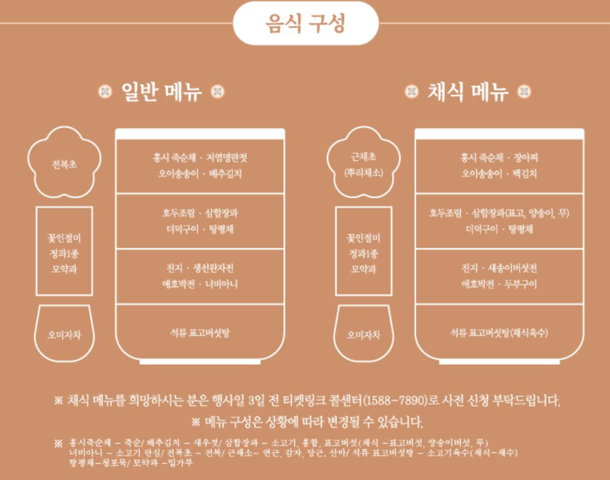 채식을 원하는 분들은 행사 3일 전에 티켓링크 콜센터 1588-7890으로 사전 신청하도록 하자