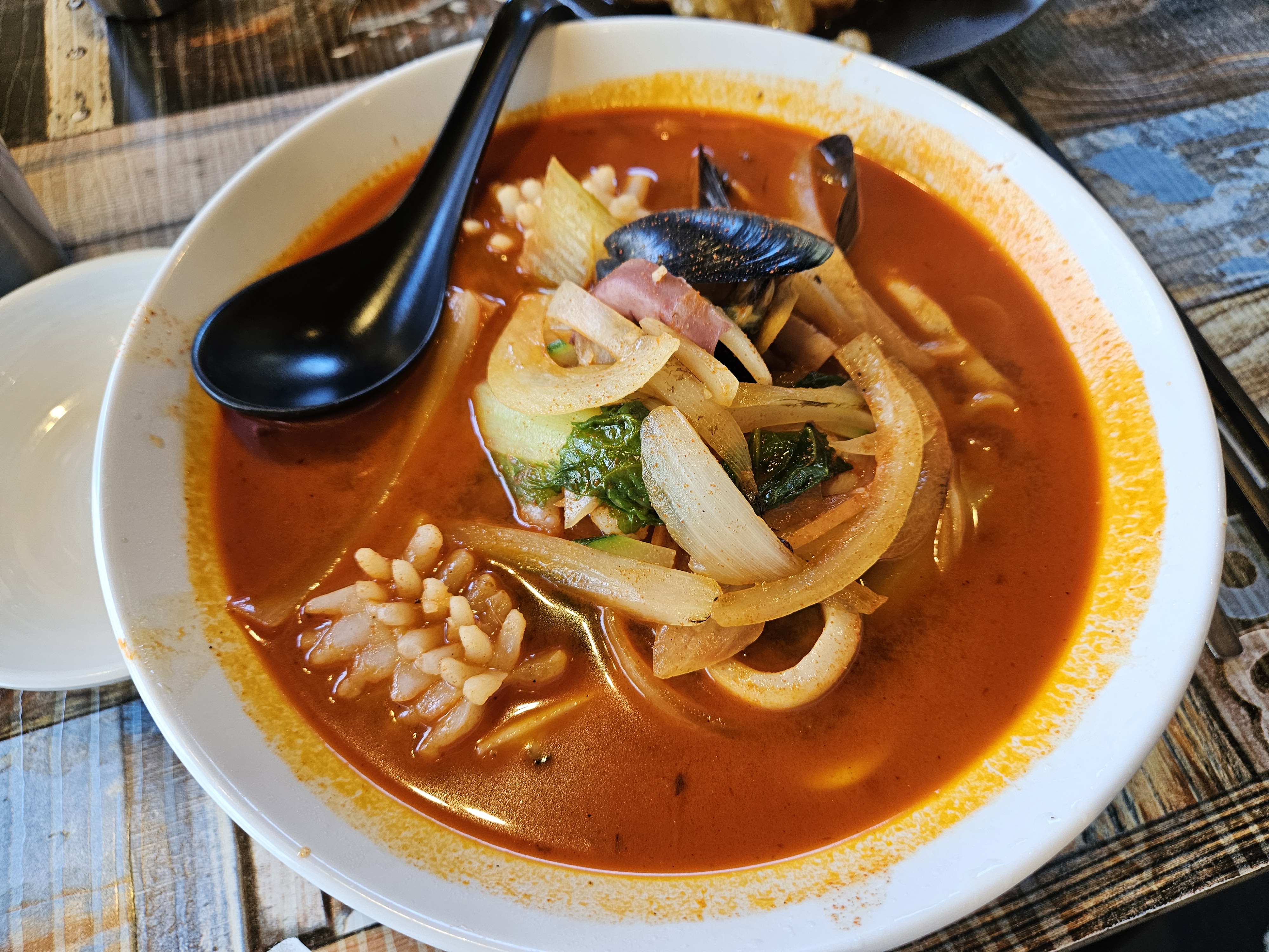 해산물로 오징어, 홍합, 새우가 들어 있었고