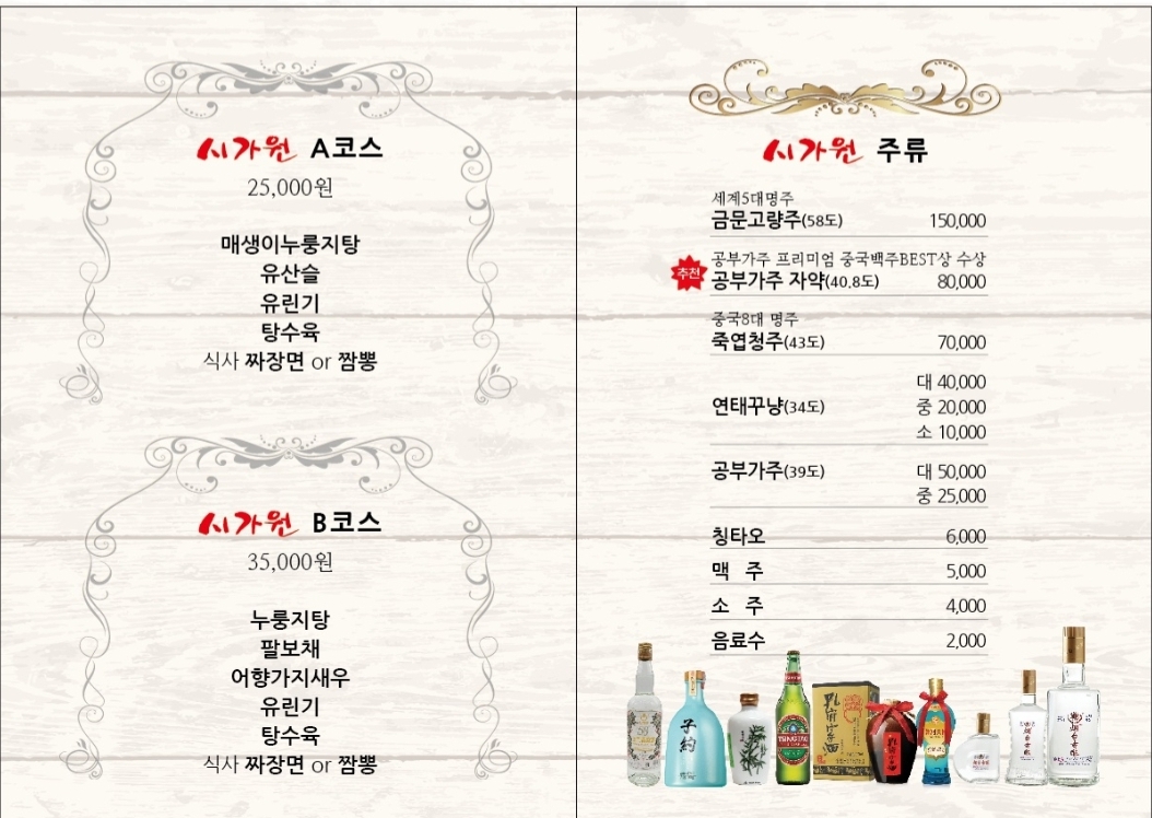 - 누룽지탕, 팔보채, 어향가지 새우, 유린기, 탕수육, 짜장면 또는 짬뽕