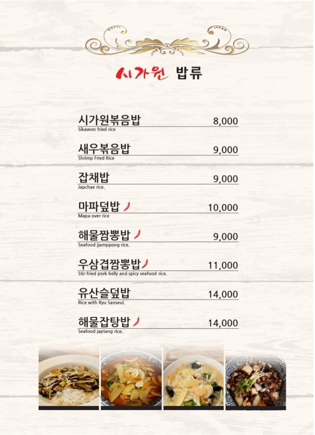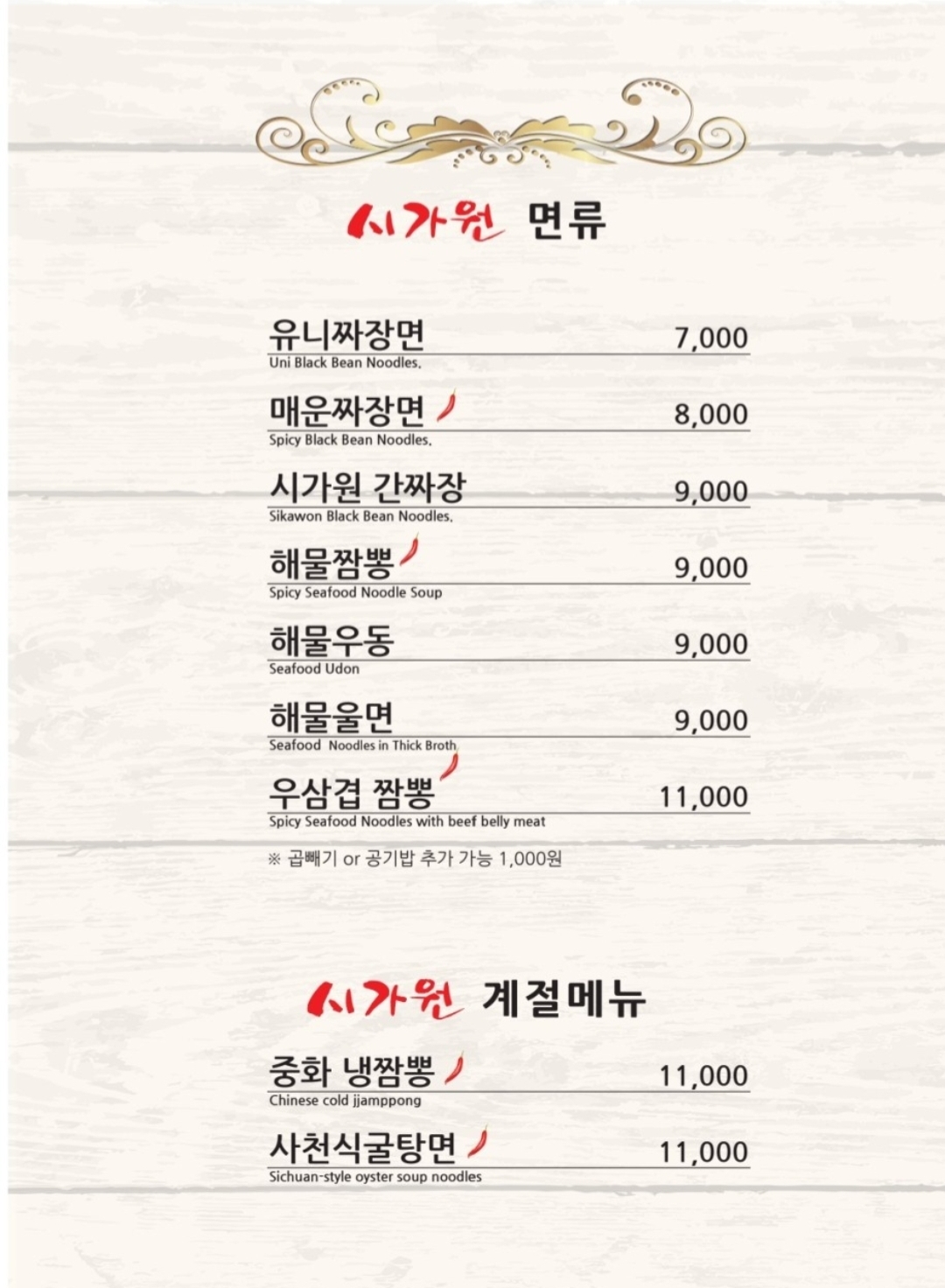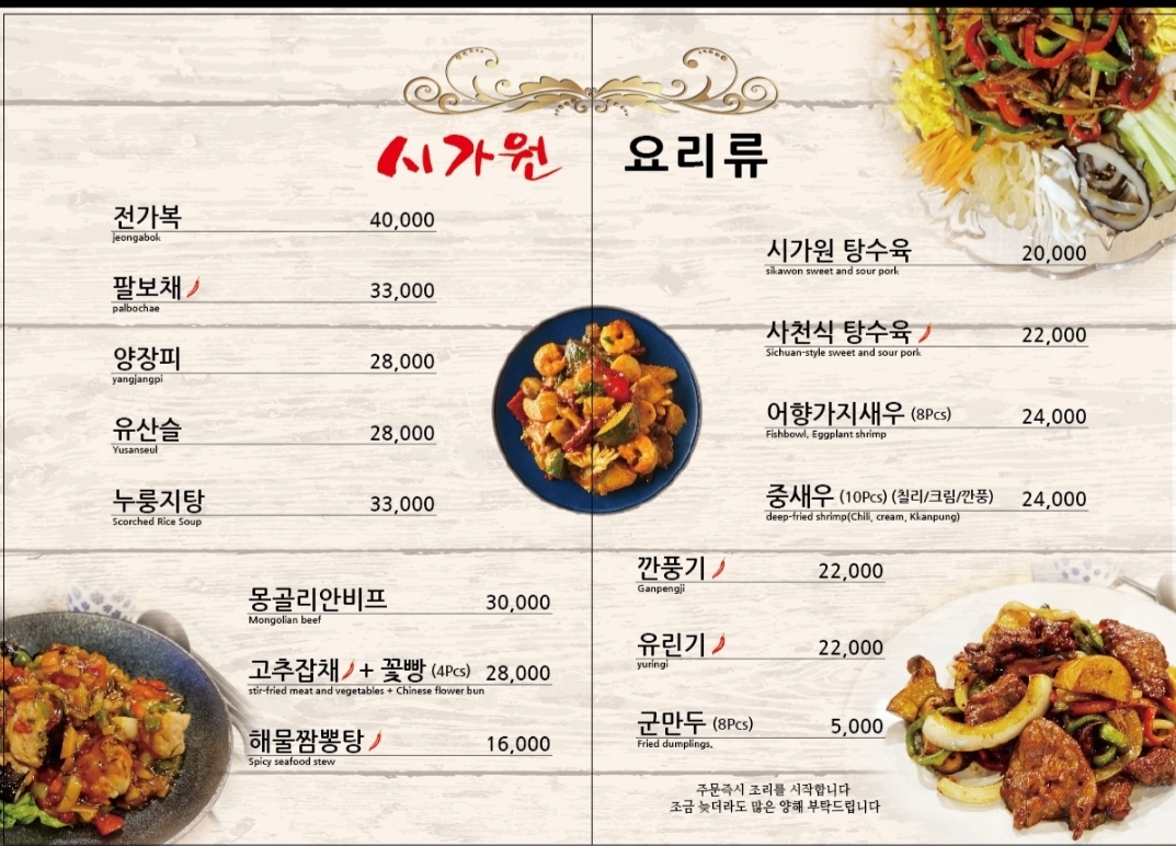 - 매생이 누룽지탕, 유산슬, 유린기, 탕수육, 짜짱면 또는 짬뽕