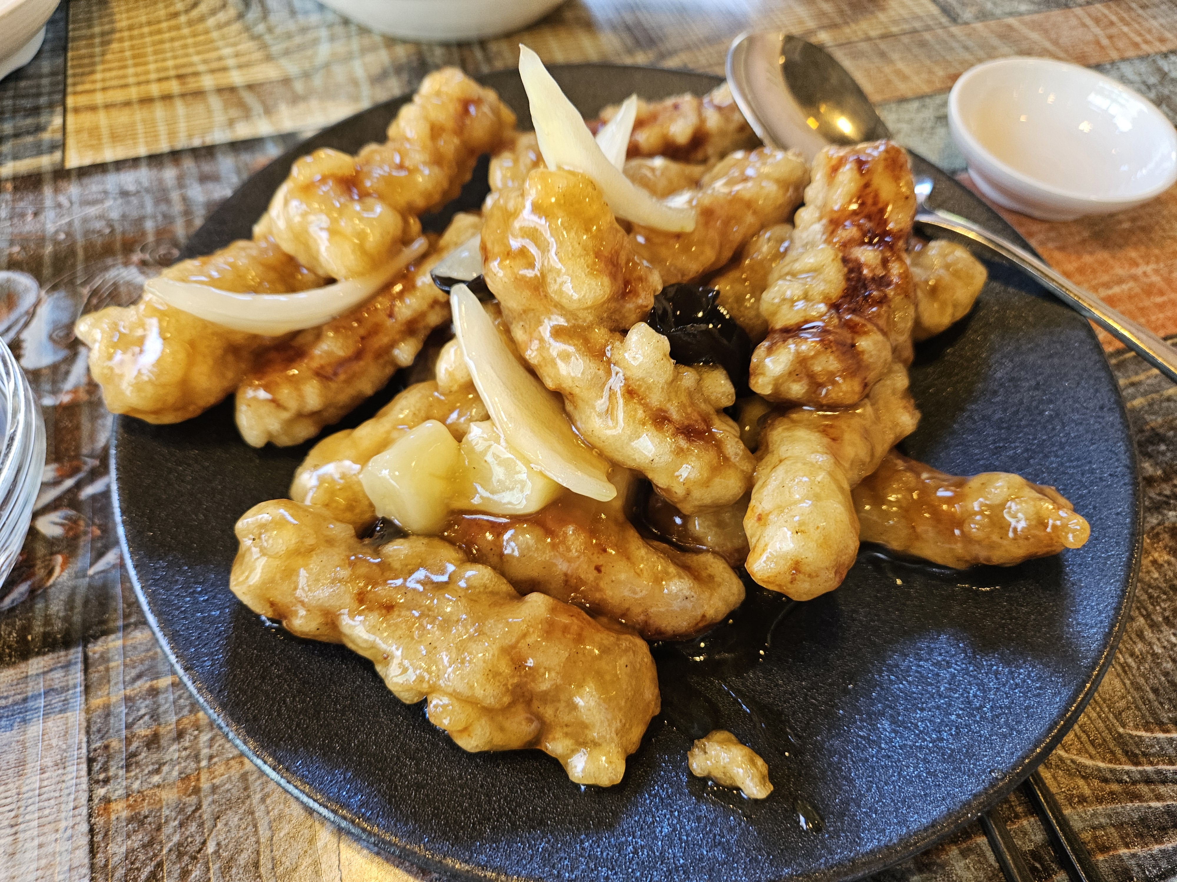 튀김옷이 얇은 편이고 이제까지 먹어봤던 탕수육 중에서 고기가 제일 두툼하게 들어가 있었던 탕수육.