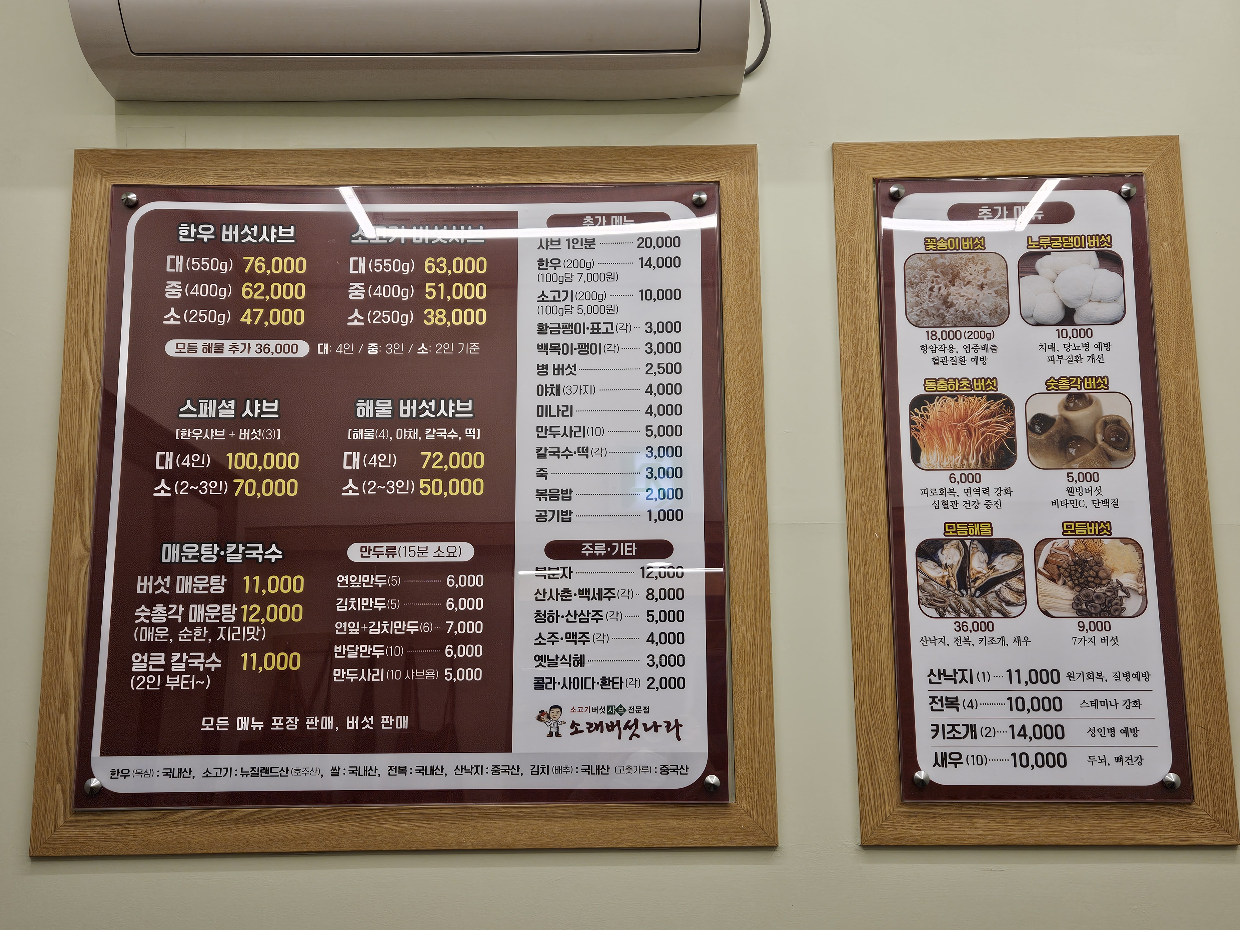 김포 풍무동 맛집 소래버섯나라 메뉴판