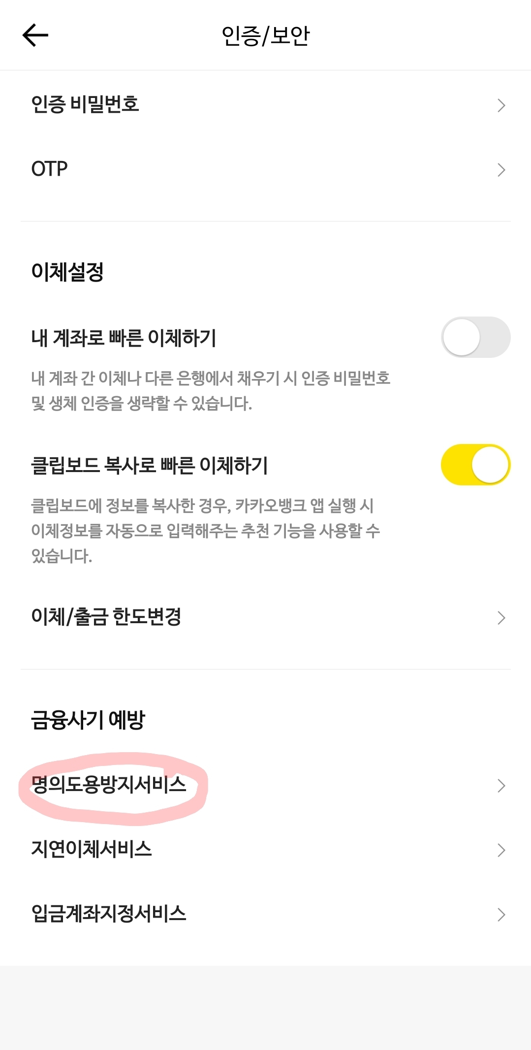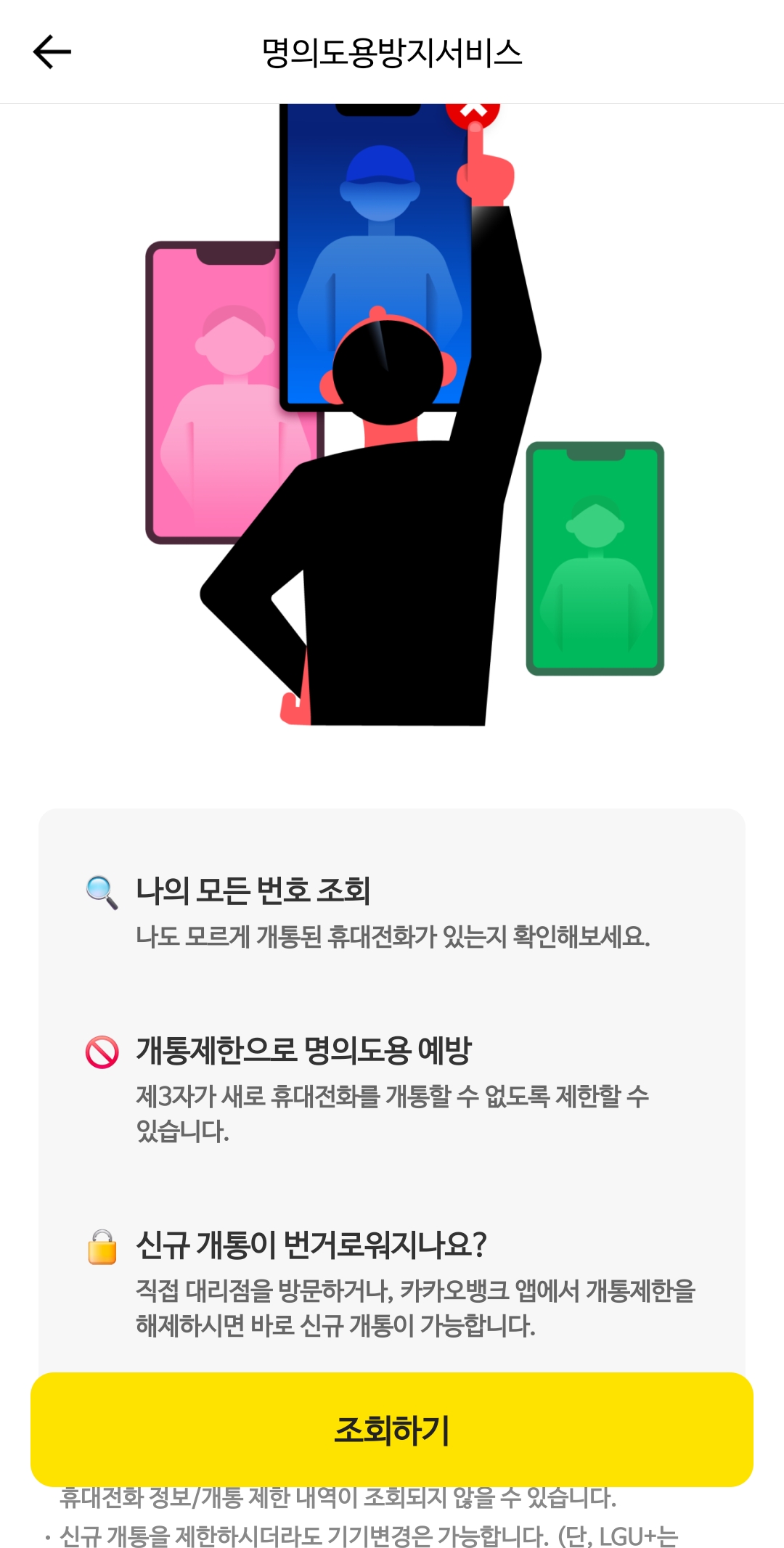 패스앱이 없고 카카오뱅크를 이용중이라면 이 어플을 통해서도 명의도용방지서비스를 신청할 수 있다