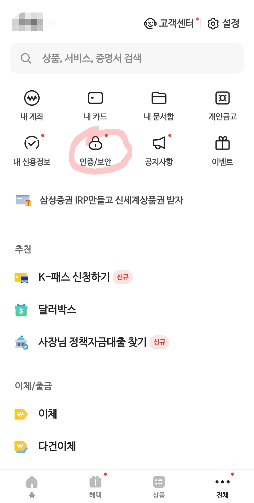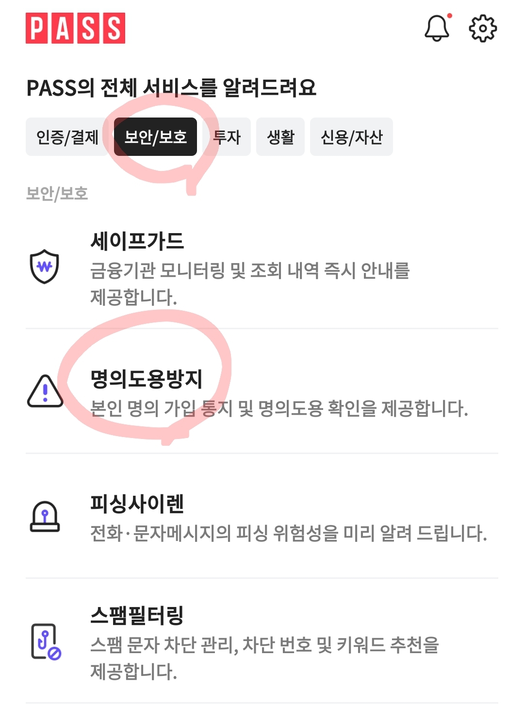 전체 메뉴 - 보안/보호 - 명의도용방지 순으로 클릭한다