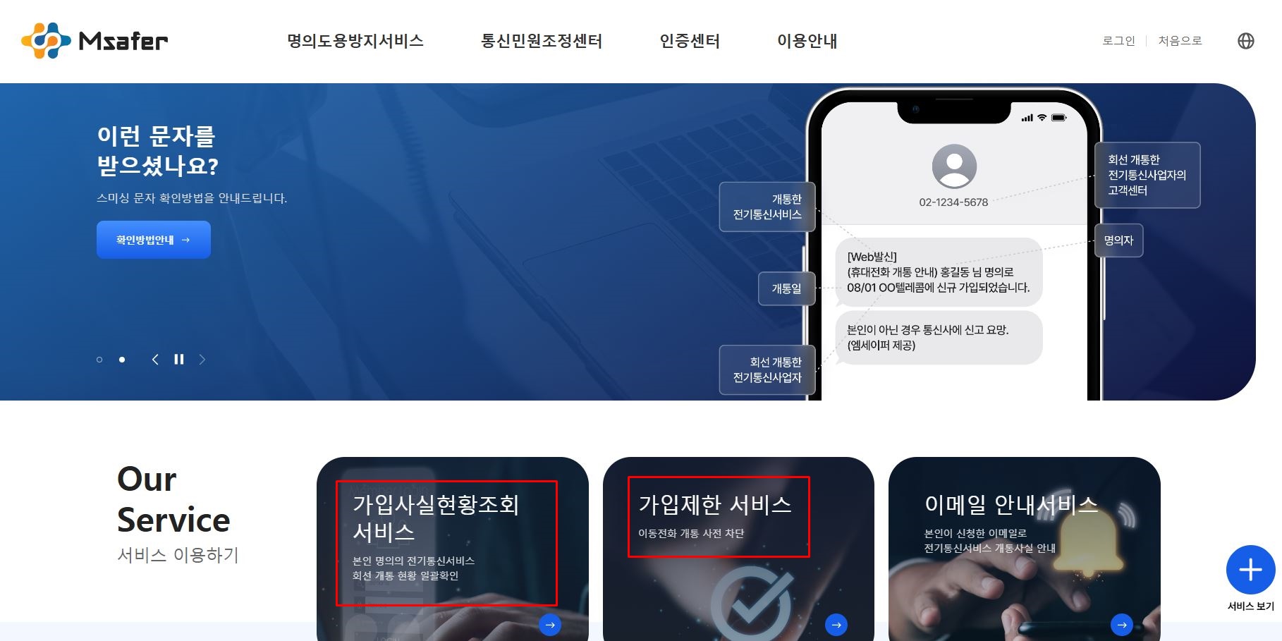 아래 엠세이프 사이트 접속 후 Our Service 매뉴 중 가입사실현황조회서비스, 가입제한 서비스를 이요할 수 있다