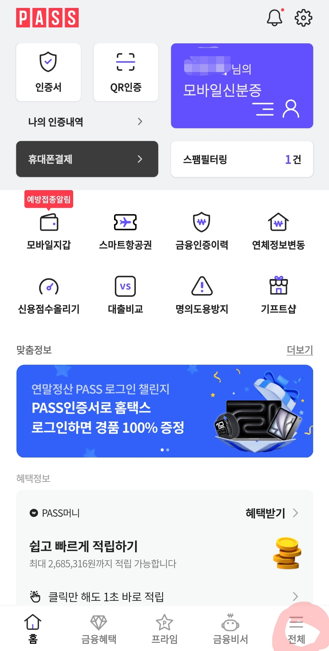 금융결제나 간편인증 등으로 자주 사용되는 어플 중 하나인 패스(PASS)앱이다.