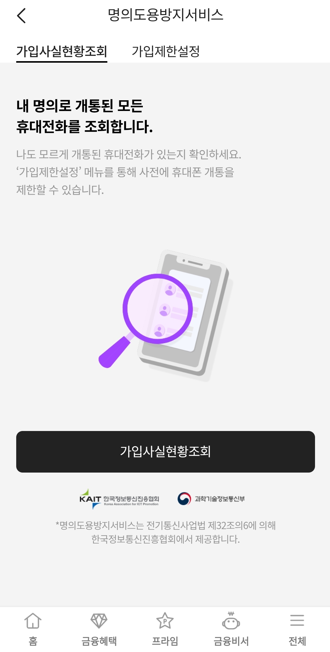 우측하단 ... (더보기) - 인증/보안 - 금융사기 예방 - 명의도용방지서비스 - 조회 및 개통 제한