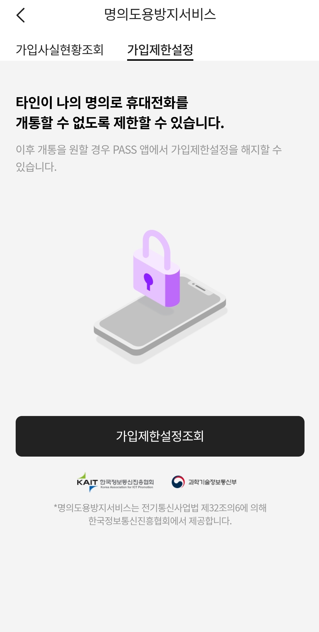아직 가입된 내역이 없더라도 만일을 위해 타인이 나의 명의로 핸드폰을 개통할 수 없도록 가입제한설정을 할 수 있다.